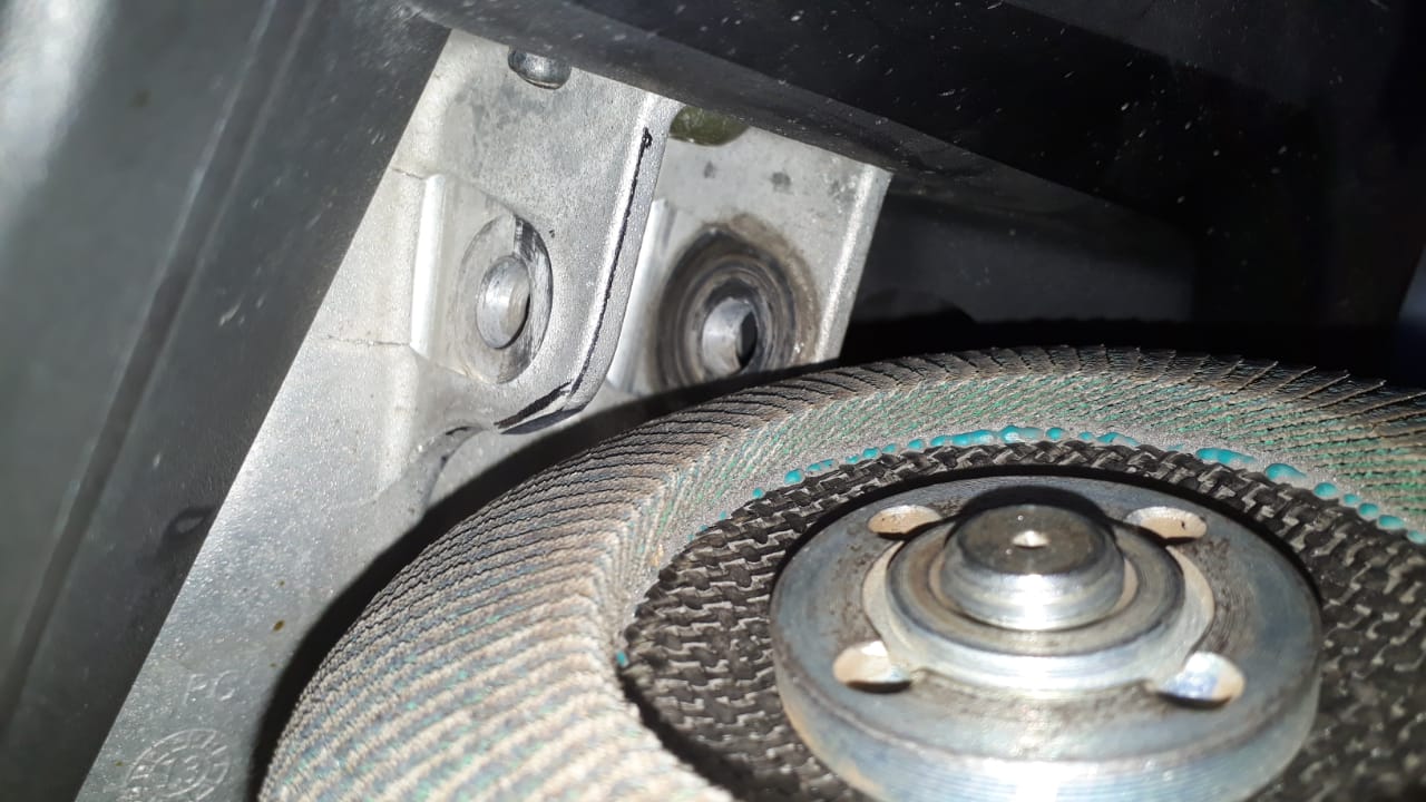 Требуются те же действия и инструмент необходимый для установки заводских рычагов. Шаровые перерисовываются, пластиковые втулки переставляются. Отличия заключаются в установке подшипника в верхнюю проушину амортизатора и подтачивании нижней части уха крепления амортизатора на подрамнике (см. фото). Подтачивать ухо необходимо для правильной работы амортизатора в момент максимального сжатия. Ухо обтачивается по лекалу примерно на 3-4 мм с нижней части (см. фото) болгаркой с лепестковым диском. В рулевой вал следует установить ограничитель хода руля (см. фото). При установке используйте фиксатор резьбы